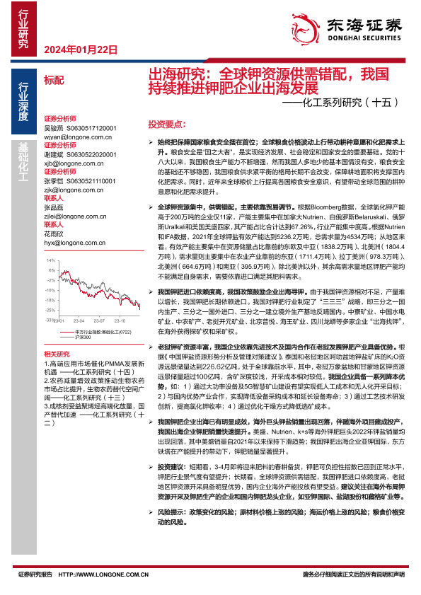 【东海证券】【20240122】出海研究:全球钾资源供需错配,我国持续推进钾肥企业出海发展-17页