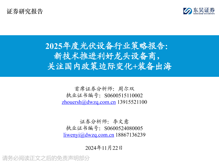 【东吴证券】【20241125】2025年度光伏设备行业策略报告:新技术推进利好龙头设备商,关注国内政策边际变化+装备出海-57页