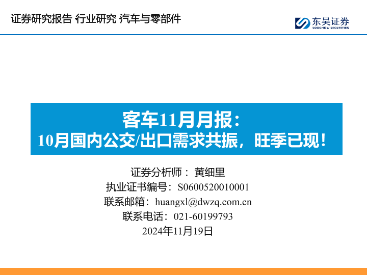 【东吴证券】【20241130】2024年11月30日更新-【东吴证券】汽车与零部件行业客车11月月报:10月国内公交/出口需求共振,旺季已现!-17页