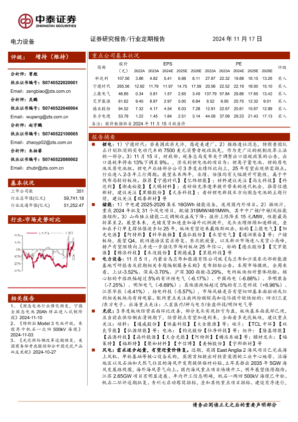 【中泰证券】【20241117】电力设备行业:光伏、电池出口退税率下调,海风招标密集发布-22页