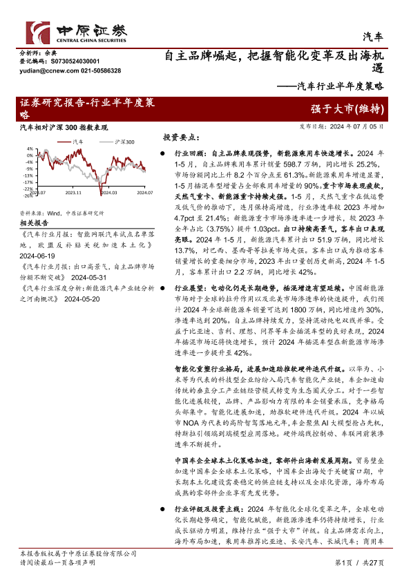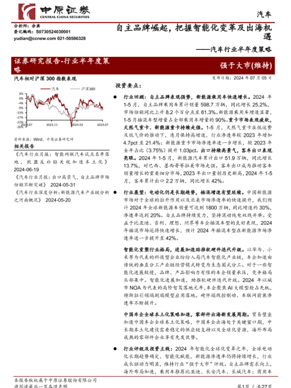 【中原证券】【20241217】2024年12月17日更新-汽车行业半年度策略:自主品牌崛起把握智能化变革及出海机遇-27页