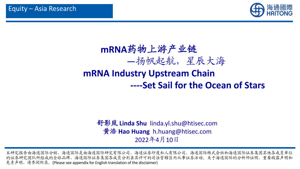 【海通国际】【20220410】医药行业mRNA药物上游产业链:扬帆起航,星辰大海-63页