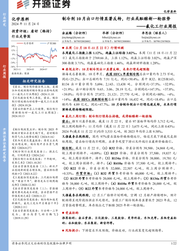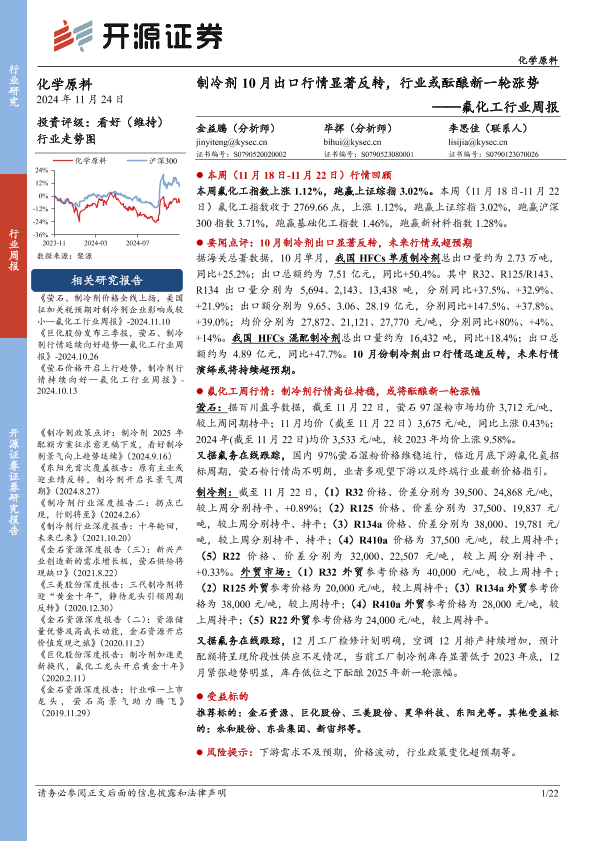 【开源证券】【20241124】氟化工行业周报:制冷剂10月出口行情显著反转,行业或酝酿新一轮涨势-22页