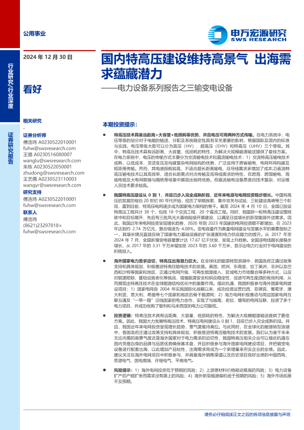 【申万宏源】【202412】2025年01月05日更新-电力设备行业系列报告之三输变电设备:国内特高压建设维持高景气出海需求蕴藏潜力-39页