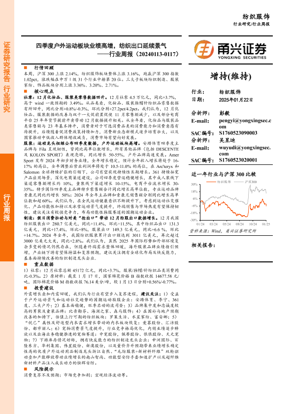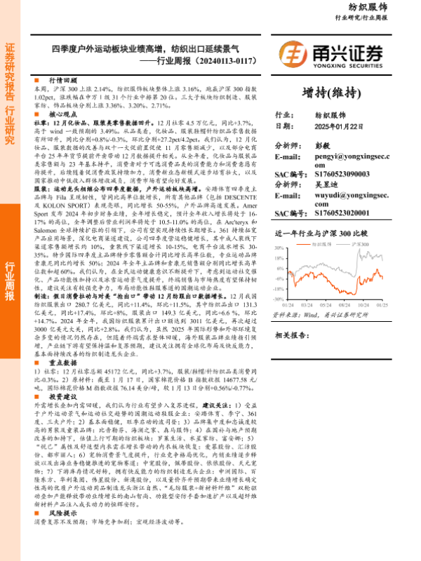 【甬兴证券】【20250124】纺织服饰行业周报:四季度户外运动板块业绩高增,纺织出口延续景气-13页