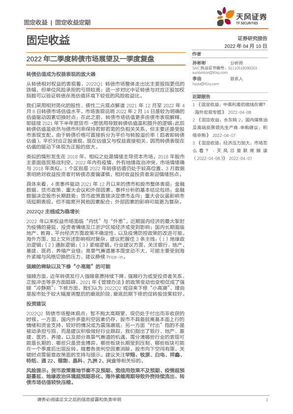 【天风证券】【20220410】固定收益:2022年二季度转债市场展望及一季度复盘-16页