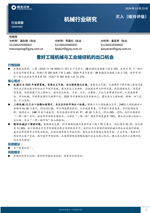 【国金证券】【20250209】机械行业周报:看好工程机械与工业缝纫机的出口机会-18页