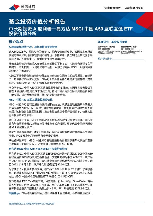 【国信证券】【20220412】基金投资价值分析报告:易方达MSCI中国A50互联互通ETF投资价值分析-17页