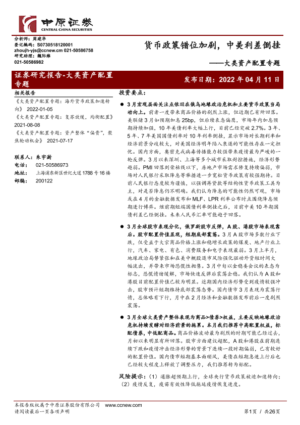 【中原证券】【20220411】大类资产配置专题:货币政策错位加剧,中美利差倒挂-26页