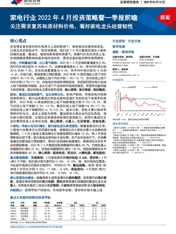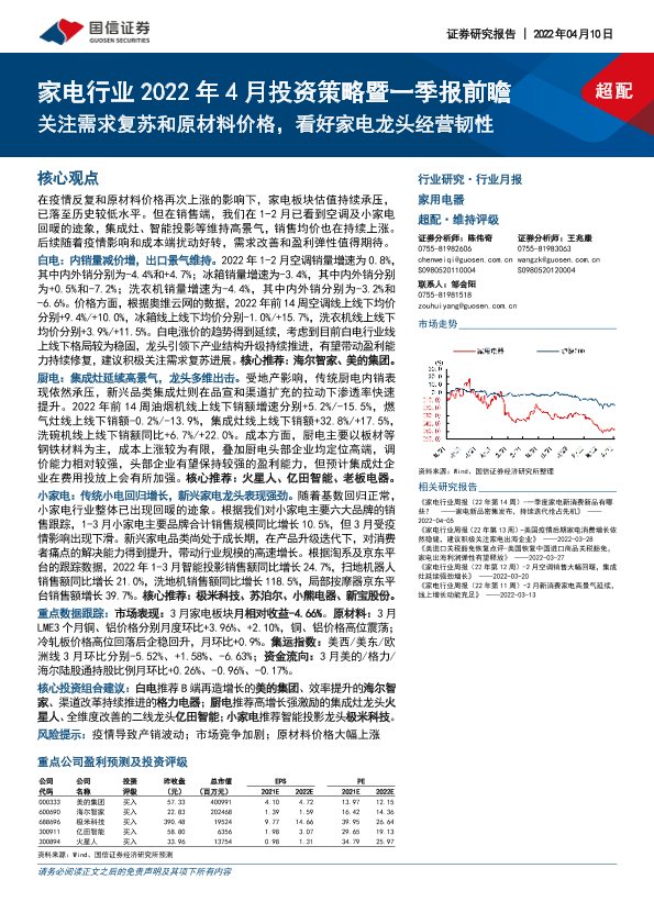 【国信证券】【20220410】家电行业2022年4月投资策略暨一季报前瞻:关注需求复苏和原材料价格,看好家电龙头经营韧性-20页