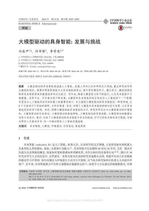 【中国科学 信息科学】【202409】大模型驱动的具身智能:发展与挑战-48页