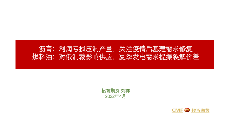 【招商期货】【20220415】沥青:利润亏损压制产量,关注疫情后基建需求修复,燃料油,对俄制裁影响供应,夏季发电需求提振裂解价差-22页