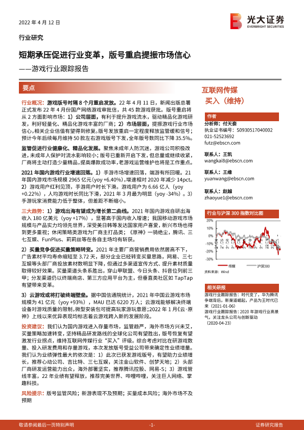 【光大证券】【20220412】游戏行业跟踪报告:短期承压促进行业变革,版号重启提振市场信心-37页