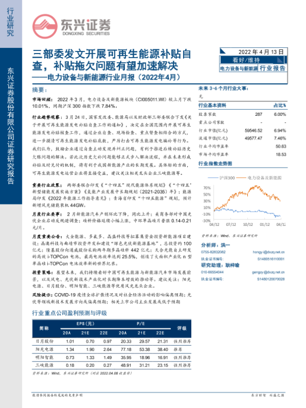【东兴证券】【20220413】电力设备与新能源行业月报(2022年4月):三部委发文开展可再生能源补贴自查,补贴拖欠问题有望加速解决-21页