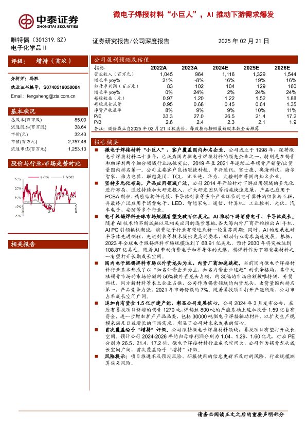 【中泰证券】【20250221】唯特偶(301319):微电子焊接材料“小巨人”,AI推动下游需求爆发-20页