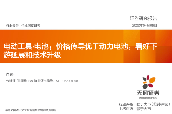 【天风证券】【20220408】电力设备行业电动工具·电池:价格传导优于动力电池,看好下游延展和技术升级-34页
