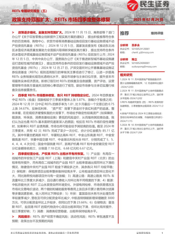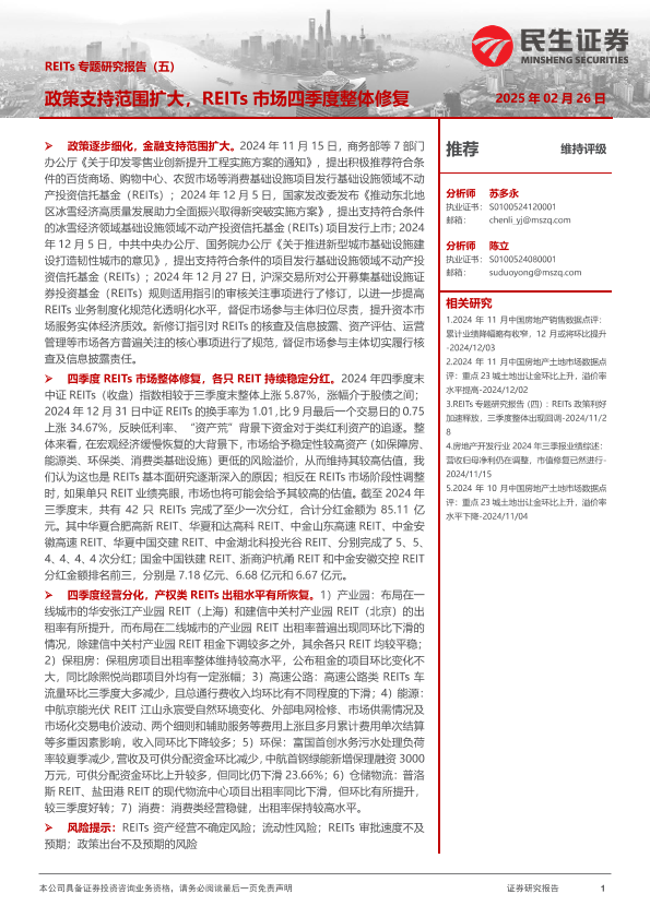 【民生证券】【20250226】2025-02-26-REITs专题研究报告(五):政策支持范围扩大,REITs市场四季度整体修复-30页