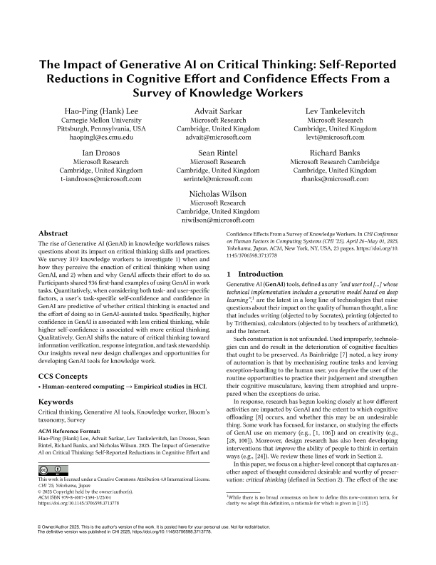人工智能 知识工作者 认知努力 批判性思维 调查报告