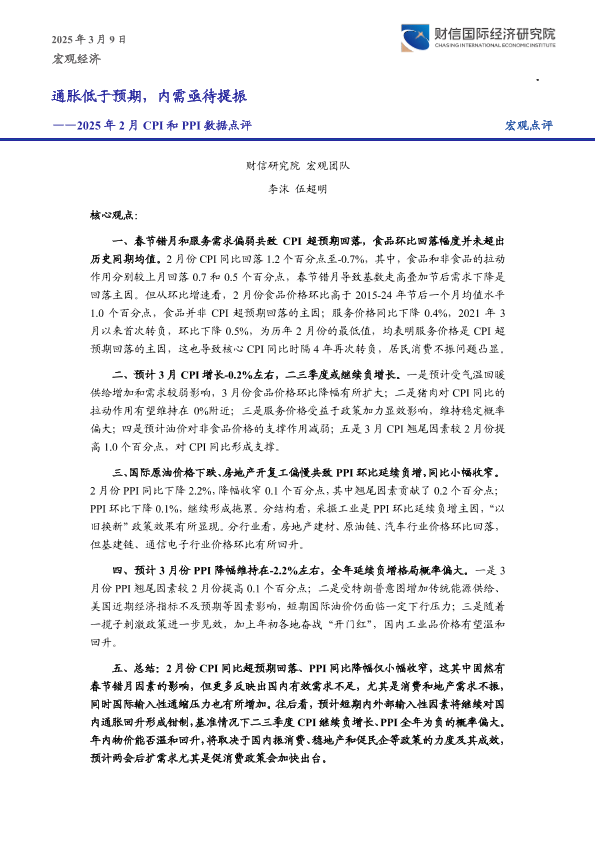 【财信证券】【20250308】2025年2月CPI和PPI数据点评:通胀低于预期,内需亟待提振-7页