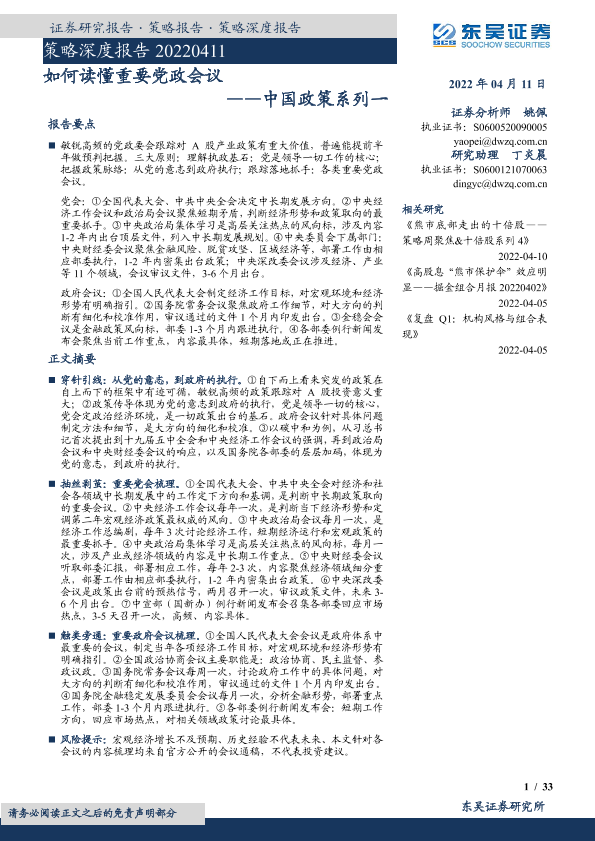 【东吴证券】【20220411】策略深度报告:中国政策系列一,如何读懂重要党政会议-33页