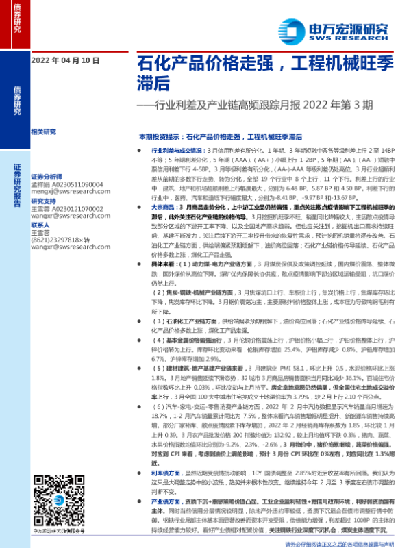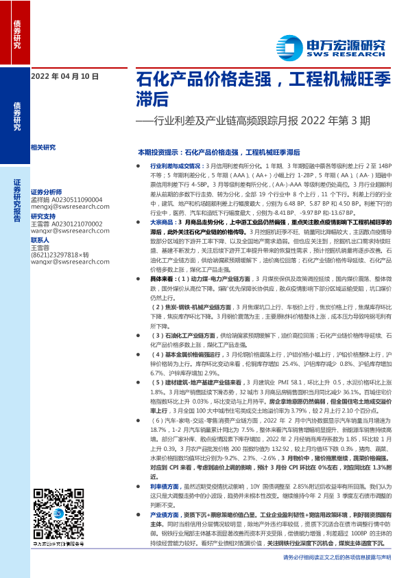 【申万宏源】【20220410】行业利差及产业链高频跟踪月报2022年第3期:石化产品价格走强,工程机械旺季滞后-24页