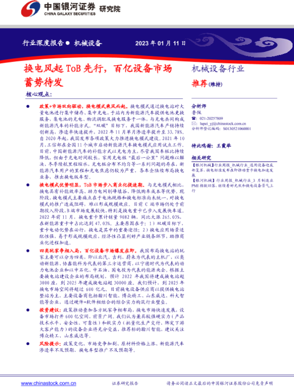 【银河证券】【20230111】2023-01-12-机械设备行业深度报告-换电风起ToB先行-百亿设备市场蓄势待发-40页