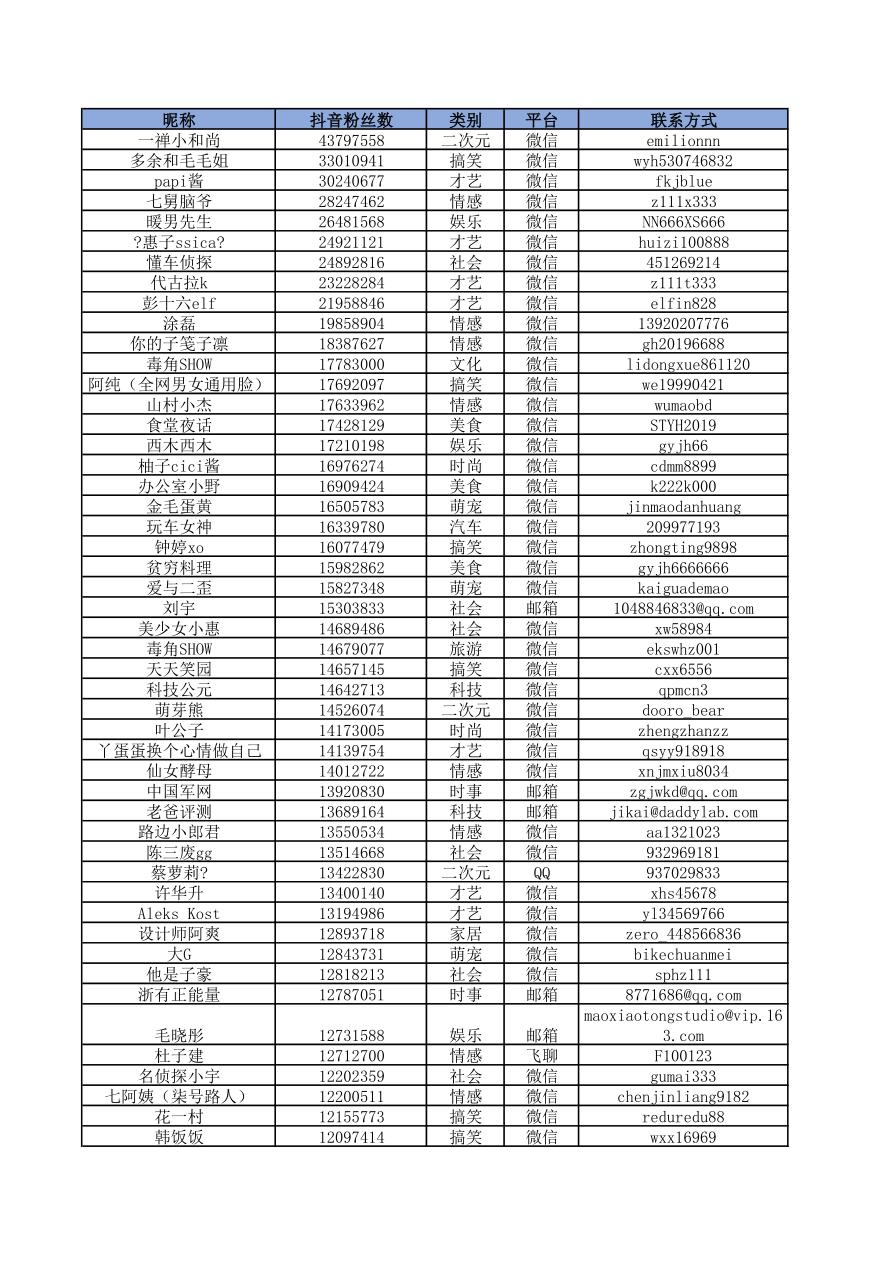 抖音网红 社交媒体 粉丝互动 联系信息 营销资源