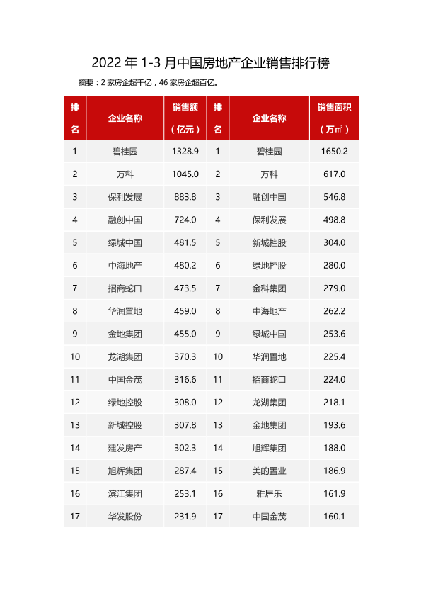 【CREIS中指数据】【20220101】2022年1-3月中国房地产企业销售业绩排行榜-18页