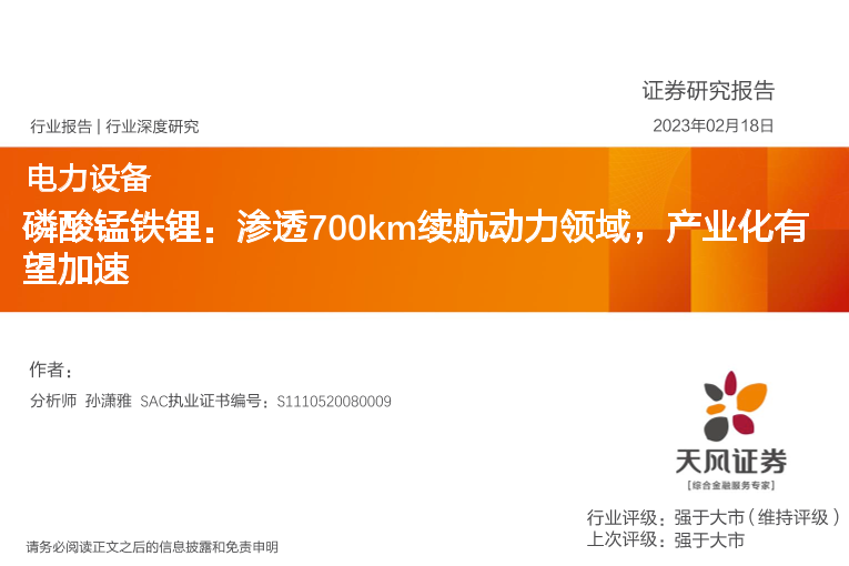 【天风证券】【20230218】电力设备行业深度研究-磷酸锰铁锂-渗透700km续航动力领域-产业化有望加速-44页