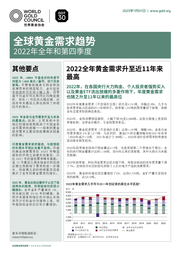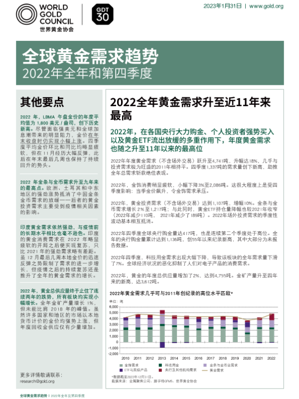 【世界黄金协会】【20230223】2022第四季度暨全年全球黄金需求趋势报告-1页