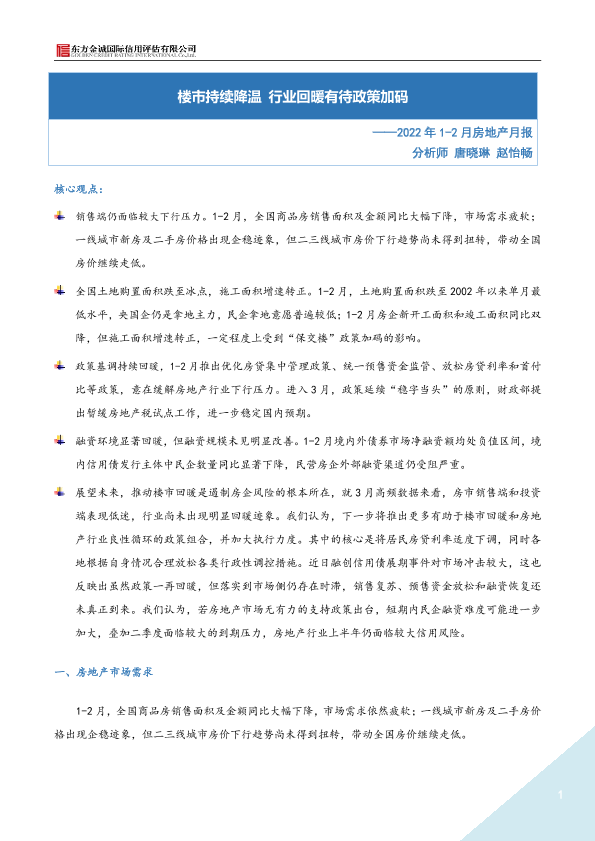 【东方金诚】【20220228】2022年1-2月房地月报:楼市持续降温 行业回暖有待政策加码-15页