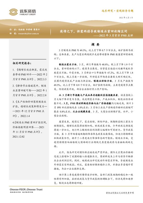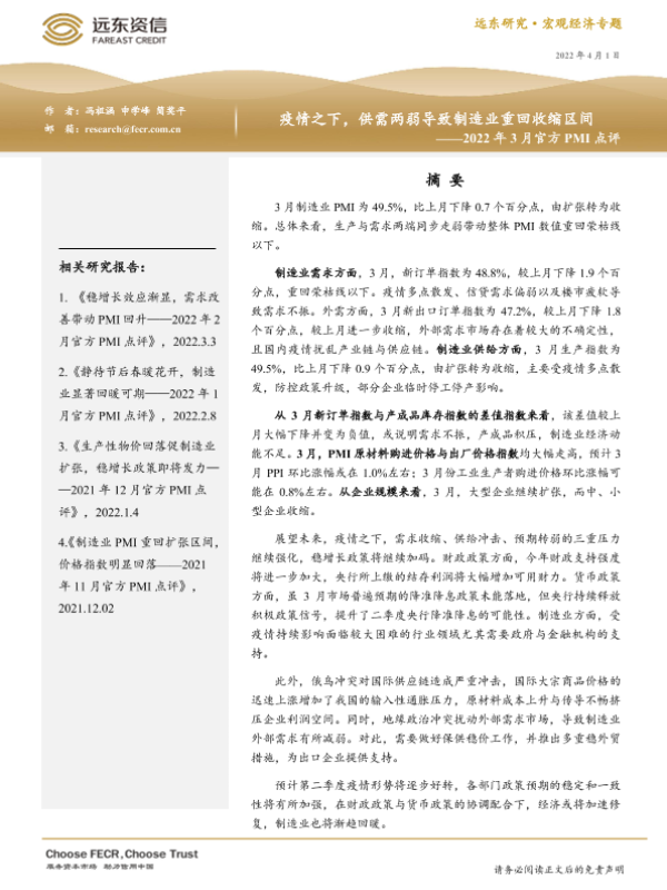 【远东资信】【20220401】远东资信-2022年3月官方PMI点评:疫情之下,供需两弱导致制造业重回收缩区间-13页