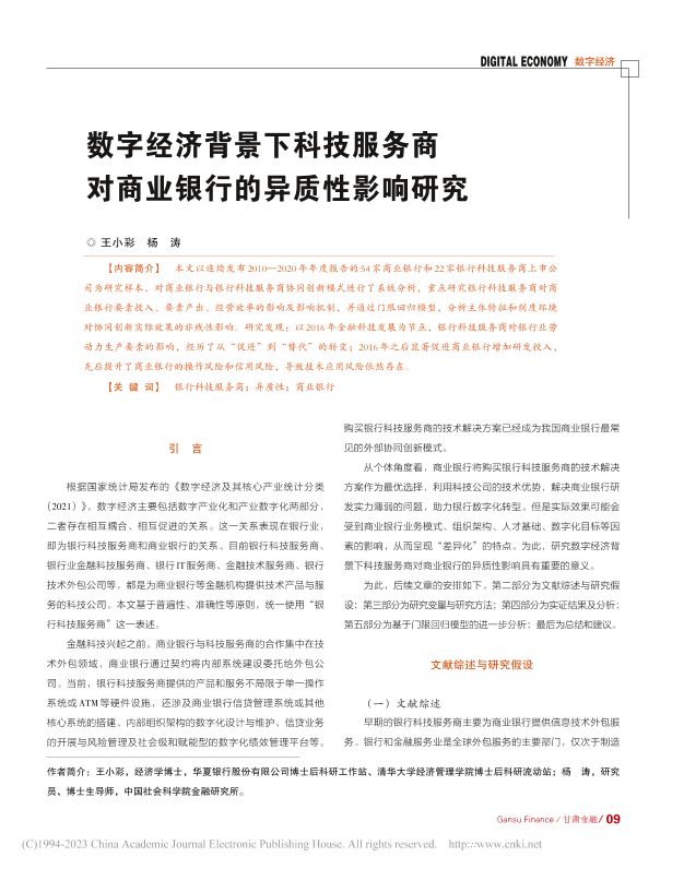 【国家金融与发展实验室NIFD】【20230406】数字经济背景下科技服务商对商业银行的异质性影响研究-12页