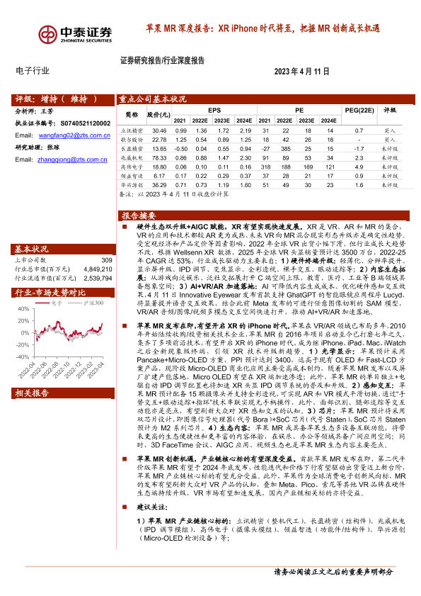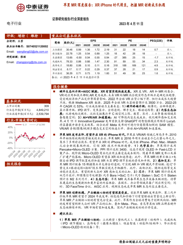 XR技术 创新成长 电子行业 苹果MR 证券分析