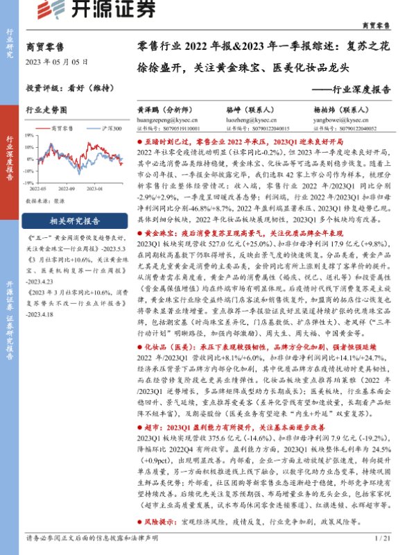 【开源证券】【20230506】2023-05-06-商贸零售行业深度报告-零售行业2022年报&2023年一季报综述-复苏之花徐徐盛开-关注黄金珠宝、医美化妆品龙头-21页