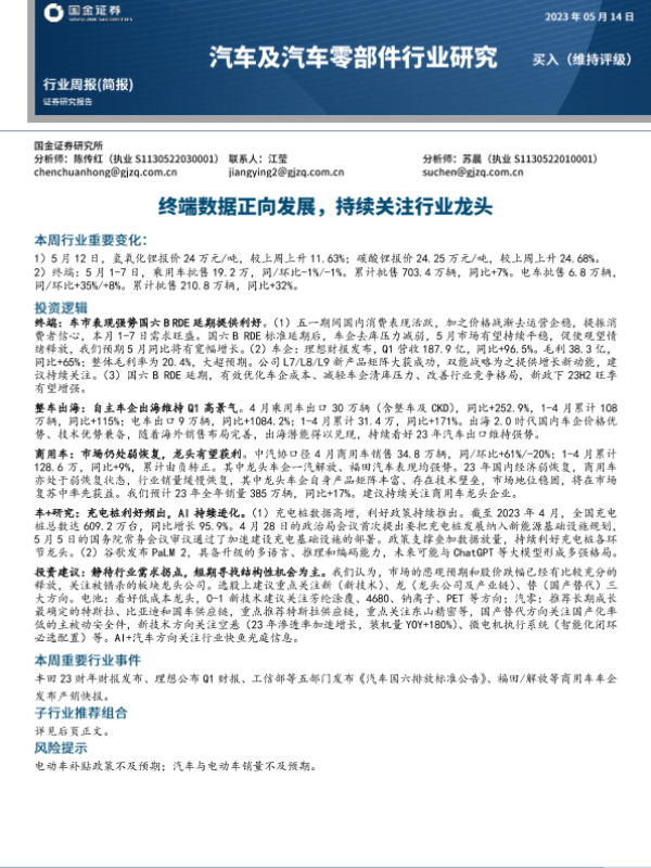 【国金证券】【20230515】2023-05-15-汽车及汽车零部件行业研究-终端数据正向发展-持续关注行业龙头-15页