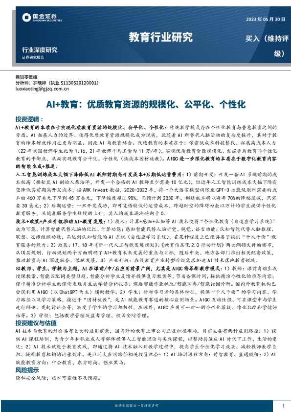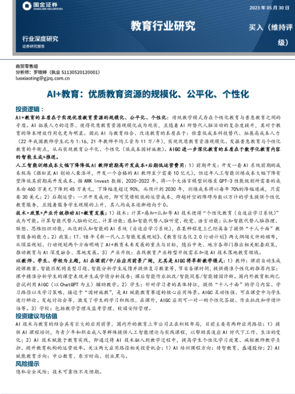 【国金证券】【20230531】2023-05-31-教育行业研究-AI+教育-优质教育资源的规模化、公平化、个性化-40页