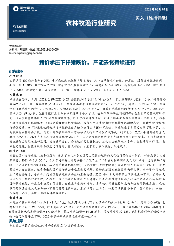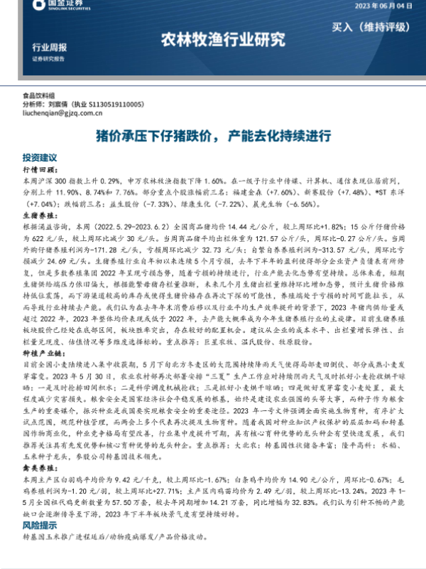 【国金证券】【20230605】2023-06-05-农林牧渔行业研究-猪价承压下仔猪跌价-产能去化持续进行-16页