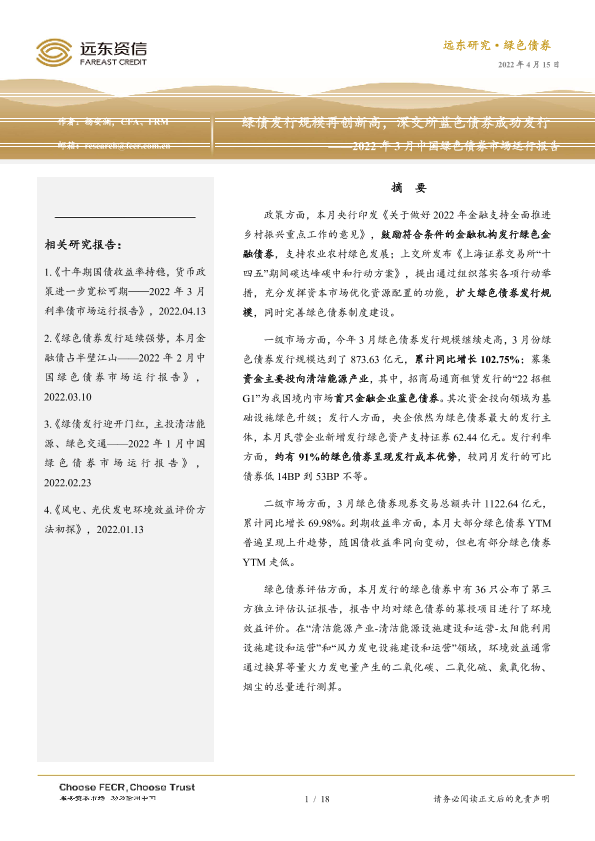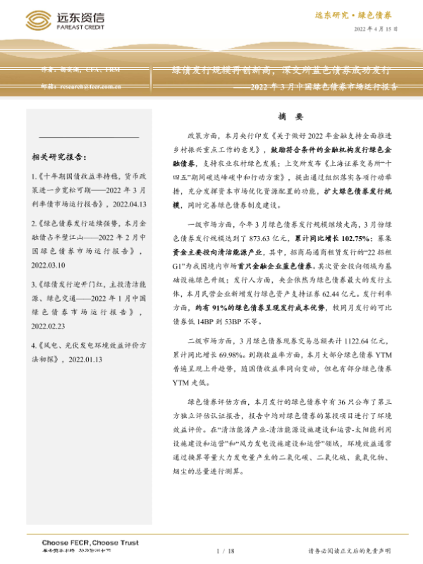 【远东资信】【20220415】2022年3月中国绿色债券市场运行报告:绿债发行规模再创新高,深交所蓝色债券成功发行-18页
