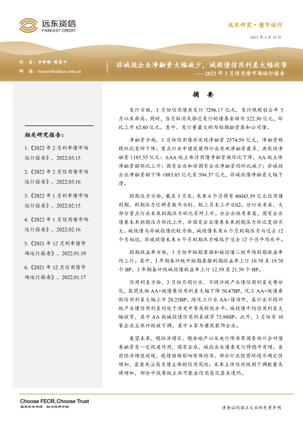 【远东资信】【20220415】2022年3月信用债市场运行报告:非城投企业净融资大幅减少,城投债信用利差大幅收窄-18页