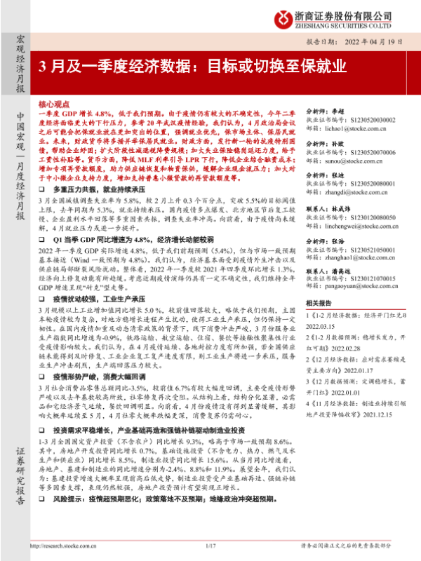 【浙商证券】【20220419】3月及一季度经济数据:目标或切换至保就业-17页