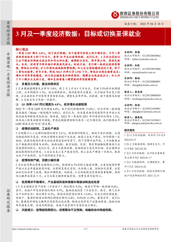 【浙商证券】【20220418】3月及一季度经济数据:目标或切换至保就业-17页