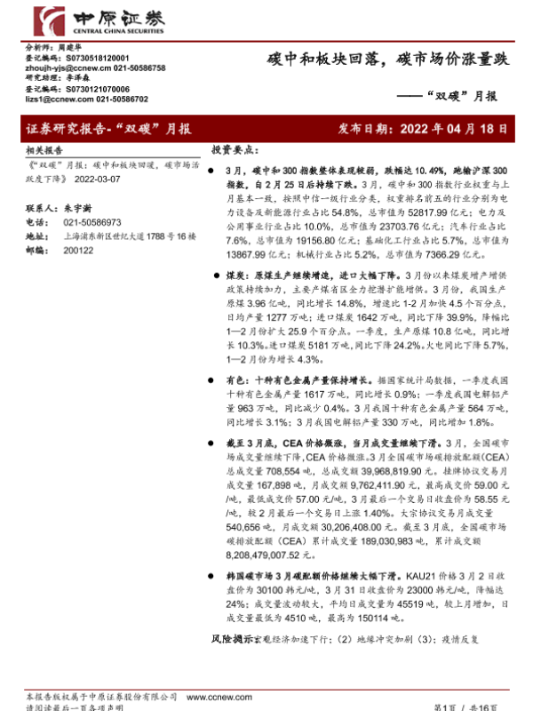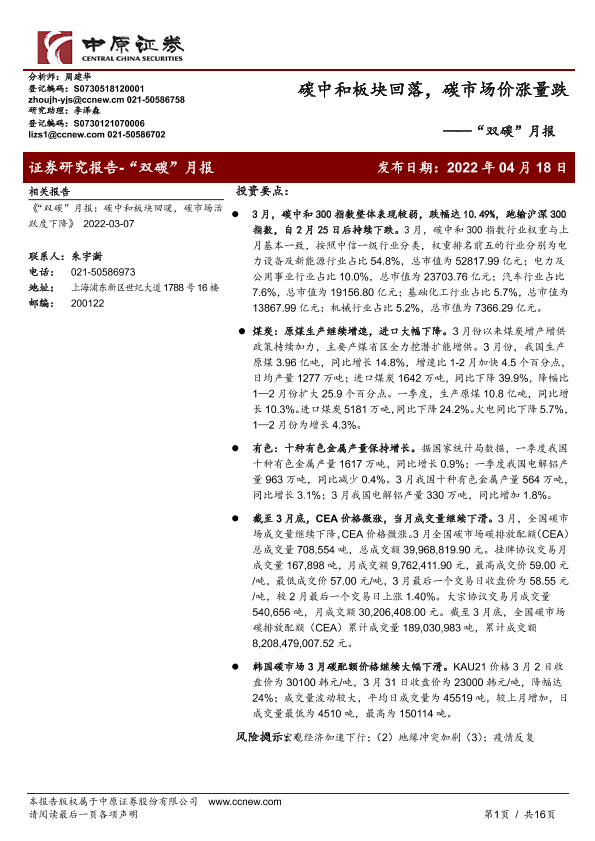 【中原证券】【20220418】“双碳”月报:碳中和板块回落,碳市场价涨量跌-16页