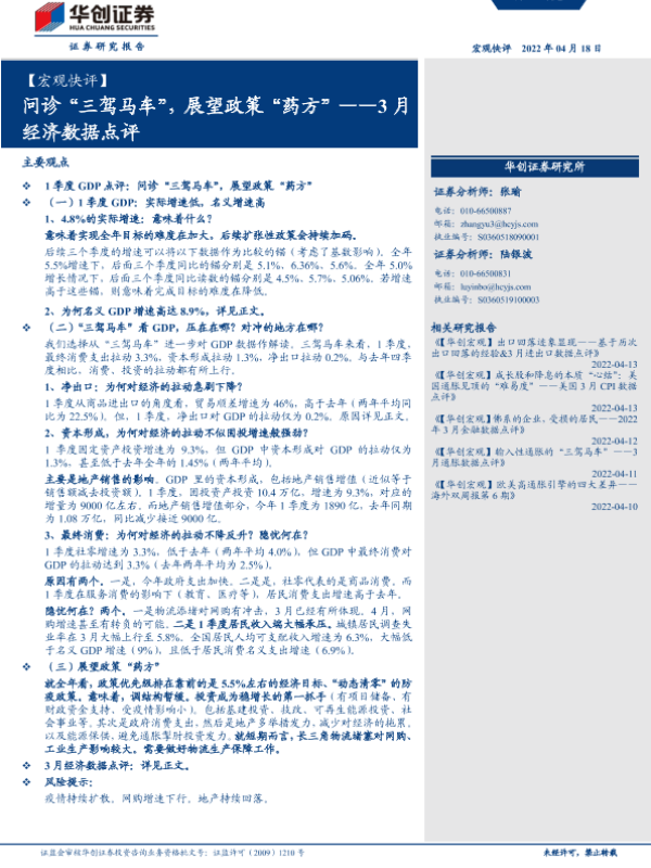 【华创证券】【20220418】【宏观快评】3月经济数据点评:问诊“三驾马车”,展望政策“药方”-19页