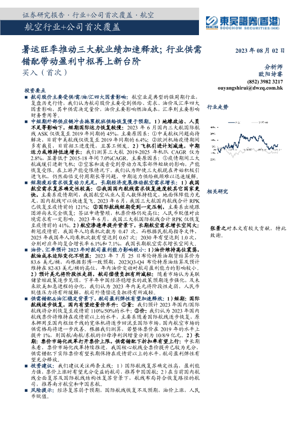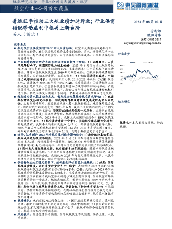 【东吴证券(香港)】【20230803】暑运旺季推动三大航业绩加速释放;行业供需错配带动盈利中枢再上新台阶-33页