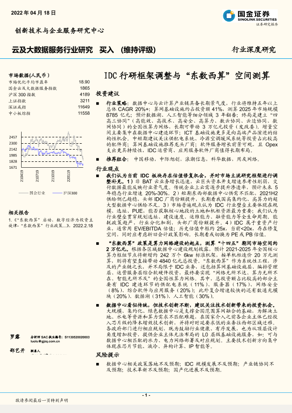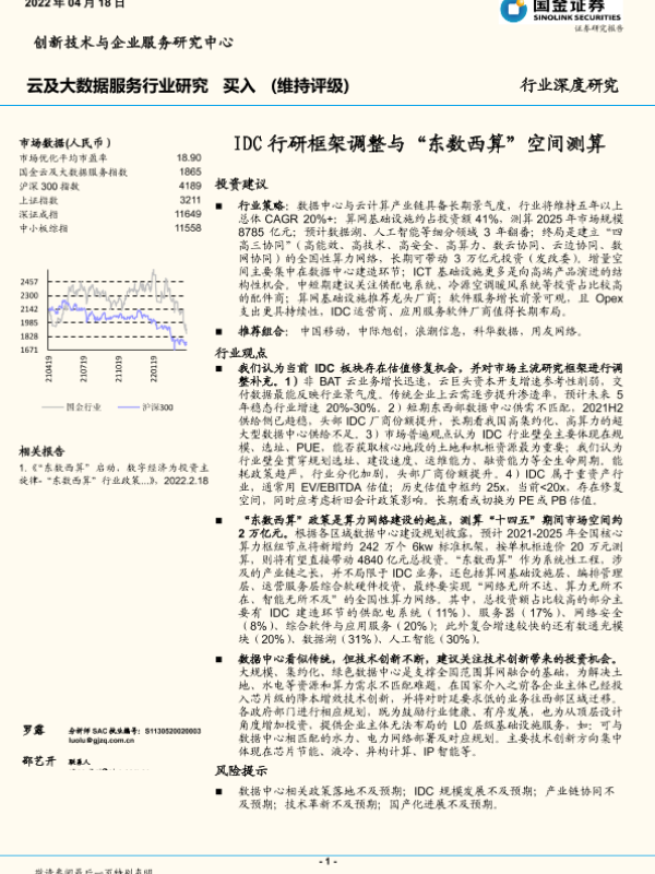 【国金证券】【20220418】云及大数据服务行业:IDC行研框架调整与“东数西算”空间测算-21页