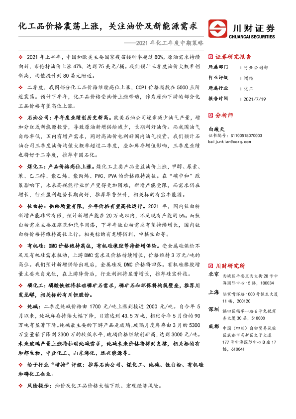 【川财证券】【20210719】2021年化工年度中期策略:化工品价格震荡上涨,关注油价及新能源需求-29页