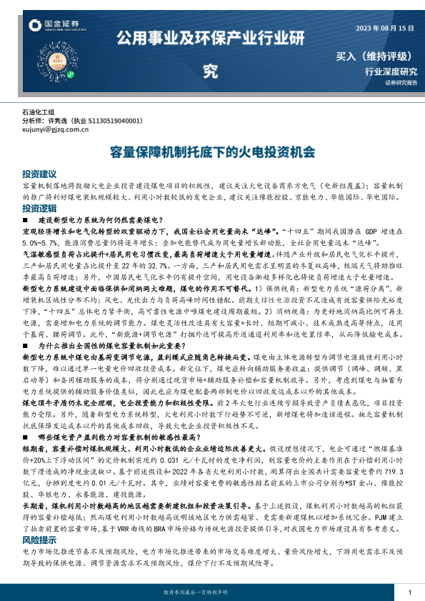 【国金证券】【20230816】2023-08-16-公用事业及环保产业行业深度研究-容量保障机制托底下的火电投资机会-21页
