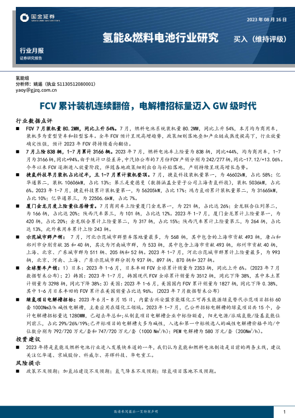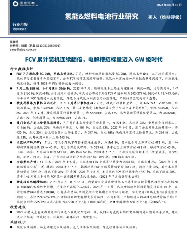 【国金证券】【20230817】2023-08-17-氢能&燃料电池行业研究-FCV累计装机连续翻倍-电解槽招标量迈入GW级时代-15页