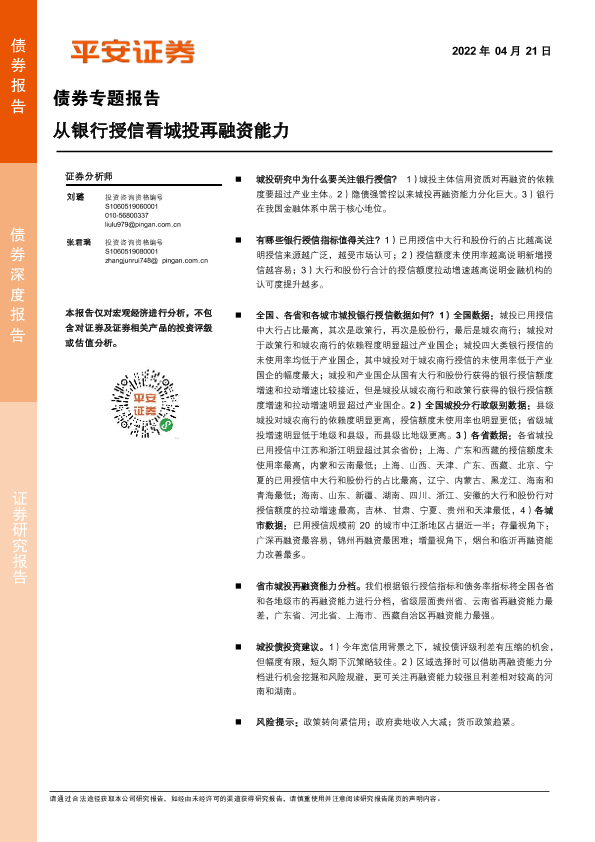 【平安证券】【20220421】债券专题报告:从银行授信看城投再融资能力-21页